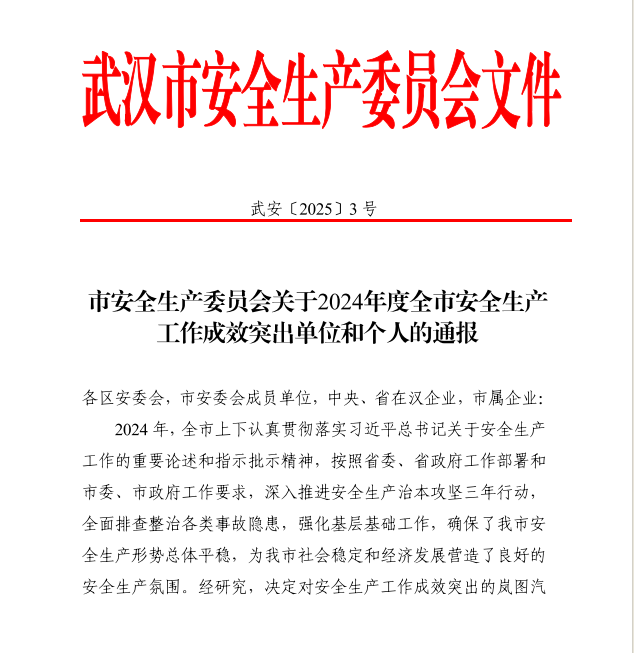 近日,武漢市安全生產委員會發布《關于2024年度全市安全生產工作成效突出單位和個人的通報》,華晟通公司榮獲武漢市2024年度安全生產工作“優秀集體”稱號,黨總支書記、董事長凡孝均獲評武漢市2024年度安全生產工作“優秀個人”榮譽。
