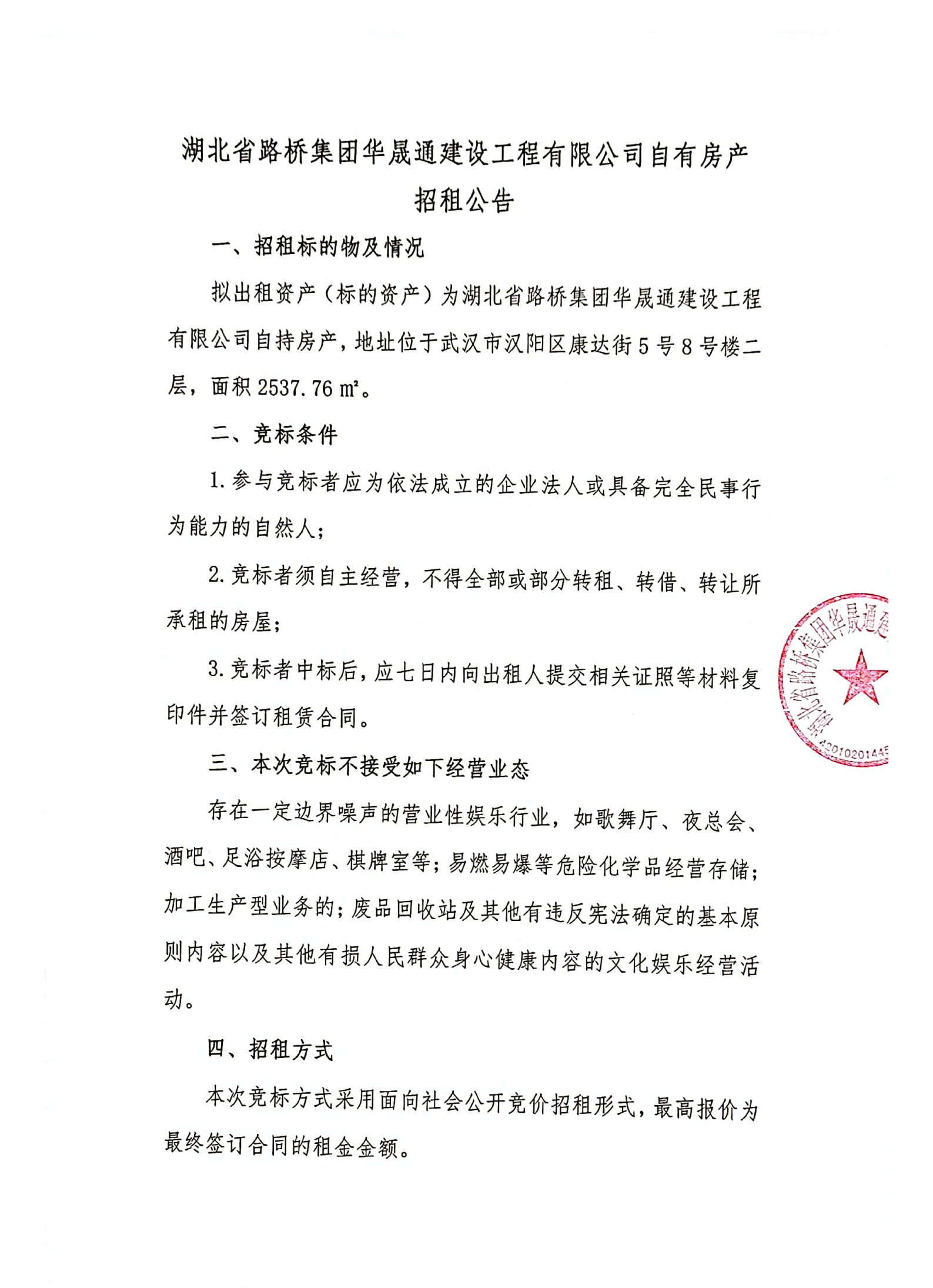 湖北省路橋集團華晟通建設工程有限公司自有房產(chǎn)招租公告